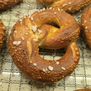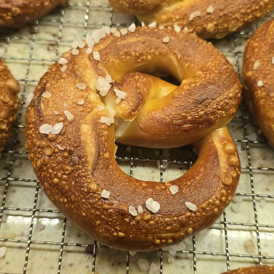 Bavyera Pretzel (Laugenbrezel) Almanya kökenli “klasik” versiyon. Kostik soda (lye) banyosuyla yapılır. Koyu kahverengi kabuk ve karakteristik aroma. Genellikle tereyağıyla ikiye bölünerek yenir. Laugen (İngilizce Lye olan) Kostik Banyoyu ifade eder.